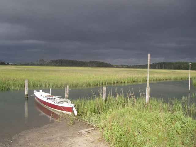 The remaining miles go by quickly and the day's travels end with a straight run into a narrow inlet, dodging boats fishing the flooding tide. A shallow marsh cove beckons about a half mile in. Before leaving the "marked" (PVC pipes stuck in the mud) channel, the MirageDrive® unit is pulled into the boat and a paddle used for the last hundred yards…and for stopping…and for reverse to set the anchor. Perfect. The cove is small enough for smooth water, but large enough to swing freely at anchor. Even if the anchor drags, all we'll encounter is mud and grass. After a quick inspection, the drive unit is stored in the rear compartment, clearing the pedal well for table space. Supper time…
