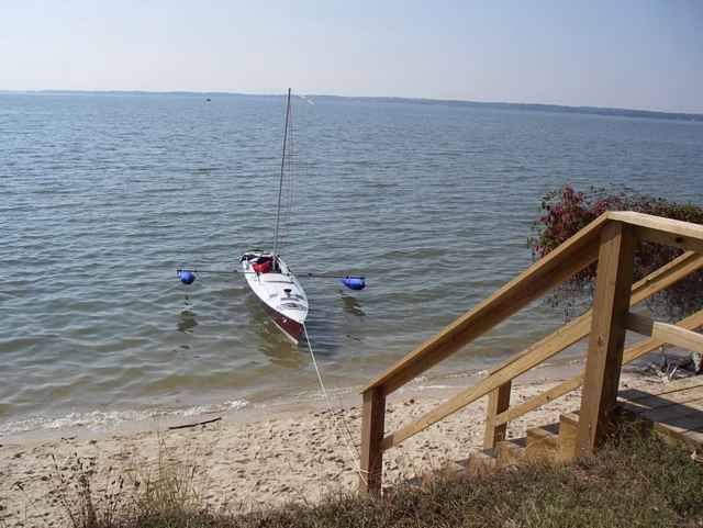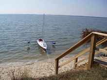 The mid-trip day begins with a gentle pedal out of a secluded anchorage. The legs are a little stiff from yesterday's exertion, but a slow cadence works out the kinks and is sufficient to ghost along at a couple of knots. An occasional tweak on the tiller line centers the boat in the gently winding channel, while pedaling otherwise leaves chilled hands free to absorb heat from a cup of coffee. The passage is almost silent. Even the Herons watch without comment. A line of crab buoys provides assurance that the bottom is clear of the fins swinging a foot and a half below the keel. The first gentle swells announce that open water is near and the hull starts to make little splashing sounds as a hint of breeze roughens the water's surface. The pink horizon allows for a study the water's surface for wave patterns betraying the location of sandbars that often inhabit the mouths of Chesapeake Bay inlets. Slow cadence, light pedal pressure and an alertness to quickly flatten the fins against the hull is maintained until well out into the Bay. Preoccupation with water depth is a Darwinian trait of pedal boaters.