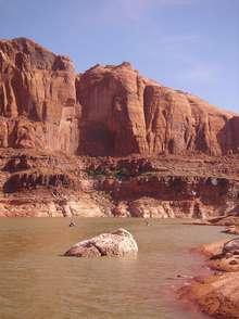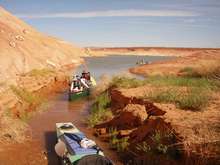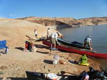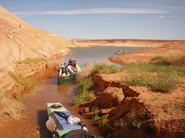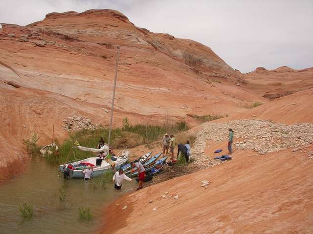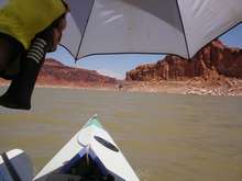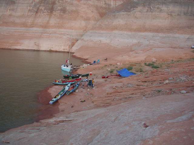The second day brought us close to Forgotten Canyon. Tom Gale brought four teenagers in an eighteen foot sailboat with a small motor on the back. As we were paddling along he cruised on ahead to scout for good camping spots. This was the norm for the trip. Finding a spot that second night proved difficult though, all the good spots were taken by houseboats. We spent a lot of time just sitting in our boats in the shade close to the canyon wall. Someone joked that it was like we were in Waterworld because we couldn’t get out of our boats. Eventually we found a small area where we could get out and stretch our legs while Tom continued searching for a good camping spot for the night.