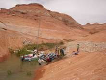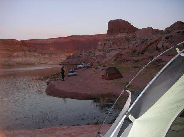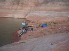 June is probably not the best time to camp at Lake Powell. With temperatures above a hundred during the day, the sand and rocks are storing up heat in the day and releasing it at night. When I was trying to sleep at night I could feel the heat radiating from the ground. I did notice that the Leinweber’s son, Joe, stretched out on a cot at night, placing him a good distance off of the ground. I have a feeling he slept much cooler than I did, but there was no way that I had room for a cot in our canoe, even if I had thought to bring one. The canoe felt overloaded as it was.