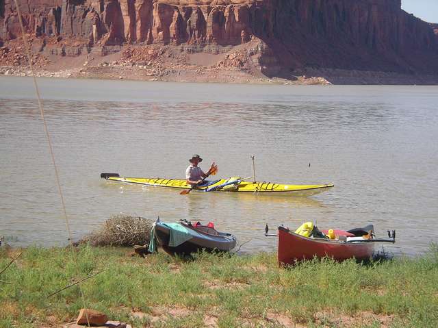 Chuck Leinweber invited me to join a group of folks at Lake Powell in June. This messabout has been going on for years and is commonly referred to as the Kokopelli cruise. I planned on getting my Michalak designed shantyboat, “Shanteuse”, finished in time for the messabout, but was unable to complete it by then. So I purchased a canoe a couple of weeks before the trip, and my daughter Cathy joined me for the adventure. I was nervous about the trip as I had not paddled a canoe in years; and that only for a brief hour on a secluded creek. Capsizing the canoe during the trip was my biggest concern, but we never did.