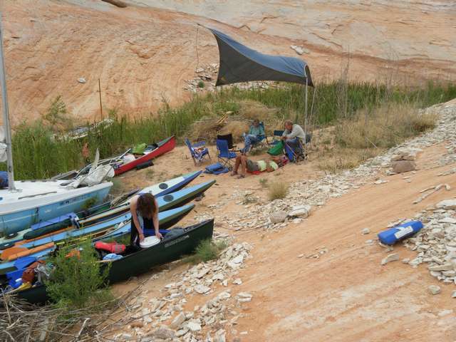 Kim went hiking up over the hill and found a gentleman who was stranded there for several days when his kayak disappeared. The man had rocked in part of a low overhang to turn it into a shelter, out of the relentless heat of the sun. After getting him some food and water, Kim led him back over the hill to the beach side where some folks picked him up to meet up with the National Park Service. We heard they got him back to his car in Hite. I’m not sure why he was unable to flag someone else down to help him before we showed up. I’m just glad Kim found him and we were able to get him some help. VHF radios are most helpful in these situations. I don’t have one, but fortunately others did.