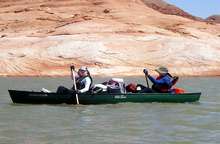 Day 6. We arose in the dark about 4:30 am, with no hint of dawn yet in the east. I was determined to be the first away. I said my farewells to my companions about 5:00, with just enough light to get pointed down the middle of the lake, knowing that the light would be increasing by the minute. Rather than sticking together as usual, I was determined to be on the road home by mid-day, so I struck out on my own. The first part of the journey was a rare, straight, eight mile section of the lake, which enabled me to steer a course, looking astern at the silhouette of rocky peaks against the pre-dawn glow. Five days at the oars seemed to have toughened up my back a bit, because the discomfort was gone. Instead of the expected ordeal, the early morning row was cool, peaceful and quiet, except for the gentle "thunk" of the oarlocks and splash of the blades. It was beautiful and inspiring. I rowed for about two hours before the sun finally cleared the canyon walls, and put me back in the unwelcome heat again, by which time I was well out of sight of our group. Power boat traffic reappeared, and the magic spell was broken. In another hour and a half, I was unloading my gear at the launching beach, just as most of Lake Powell was beginning to stir. Later in the day, on my homeward drive, I felt the fatigue of an early start and a near-nonstop row of 15 miles, but at that moment, all I felt was satisfaction at the close of another chapter in my unfinished book of Lake Powell experiences. Thanks again, Jim.