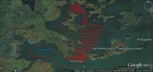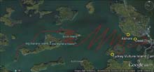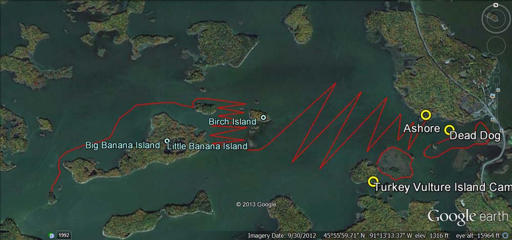 Trapped ashore at the northern edge of Dead Dog Bog. The "islands" outlined in red are the floating bogs described later in the story. An extremely strong southerly wind has us pinned down, unable to make windward progress.