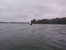 True. But I'm hoping that dropping the yard and furling the sail has reduced our windage enough that we can make some progress. I start rowing carefully westward across the bay, trying to hug the windward shore where it's a little calmer, pulling as lightly as I can to avoid stressing the bungees. It seems to be working for now. We're working our way slowly out of the swamp, out toward the narrow channel to the north, our only escape route. We might make it this time.