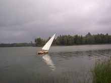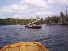 And then the rig is in the trees and the boat is aground and we're back on the northern shore. We've made about a boat length's worth of progress to windward. I jump back into the water, drag the boat around, and re- launch on the port tack.