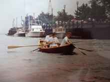 Two of the rowers from the death row rowing and me steering as we pass the Newburyport MA board walk in a borrowed swampscot dory.