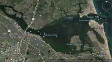 Instead of plowing directly into the center of a dangerous river mouth channel (the Banks dory shape was invented/perfected for fishing in the mouth due to the rough conditions and the US Coast Guard was born in Newburyport, MA because of the treacherous mouth). I decided to hug the shore, picking my way through the boulders left over from more than one attempt to bridle the mouth of the river, and the old steamboat dock jetties. I noticed the wind was up, it didn't hit home until I noticed a wind surfboard and sail lying in the lee of the jetty. Figuring one of the nuts must have hurt himself, I asked the guy sitting on the sand if he was ok, he told me he was fine, only the wind was more than he could handle. Knowing the conditions the wind surfers liked, I began to get a little concerned, rounding the tip of the jetty confirmed my fears. The wind was ripping directly down the long reach of the Lower Merrimack basin and Joppa Flats. We were directly downwind from Rings Island's boat slip, where the dory's lived and my car waited, and the wind was tearing the tops off the white caps.