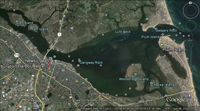 I normally went rowing in the evening summer or winter. Most of my summer rows were upstream against the current, under the Route 1 and rail bridges, then up the Salisbury side of the two lower Islands Ram and Carr's, rounding the top of Carr's Island to shoot down the main channel on the Newburyport side. Many times the Channel marks would be pulled under by the current as speeds out to sea. Thanks to that nine knot current when the tide is flowing out, even during the darkest, coldest part of the winter the river never freezes over. I would go out rowing and use the river current and wind like a tread mill. I would "box" the area, rowing up the Salisbury bank to the Route 1 bridge, crab across the river to the Newburyport Boardwalk, slide down the Boardwalk to the commercial fish pier and then crab back across the current to the Salisbury side. The lights from the Newburyport board walk lit up the "box" well enough that I didn't need a flashlight to read my watch or avoid moorings.