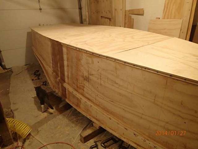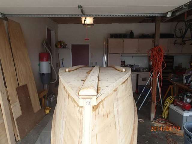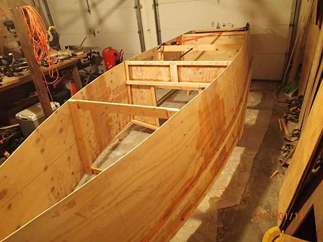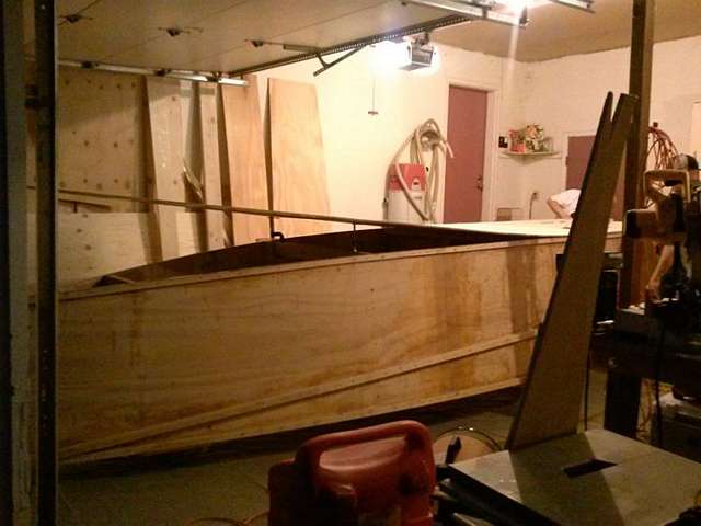 The black string is the centerline from stem to stern. I've got some twist and/or sideways displacement to resolve before "locking" the shape with the bottom panels. The red fuel can in the back is 14 gallons of diesel fuel for the garage heater. The 12v thermoelectric cooler with white lid is in "heater" mode to keep the epoxy glue warm. Anyone building a boat in Nebraska in January needs their head examined. |