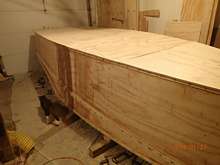 Major progress - we put the bottom panel on the hull last night. I preassembled the entire bottom panel using fiberglass tape so I wouldn't have to live with wooden butt-blocks on the floor of my boat. The downside to this approach is the entire panel has to be attached in a single operation. I was able to break the operation into halves by supporting the forward end above the hull while gluing and screwing the back half. |