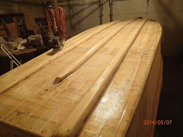 The bottom is completely glassed. Per my natural instincts I did it the hard way. Next time I will glass the bottom with wide swaths of fiberglass before attaching the strakes instead of multiple layers of 6 inch tape over and between the strakes. |