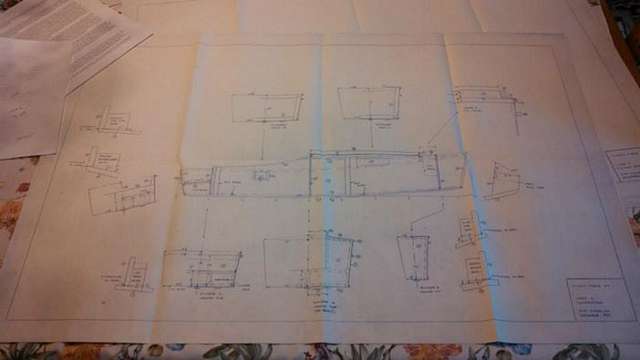 One of three pages of blueprints. This one shows bulkheads and frames dimensions. |