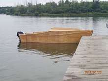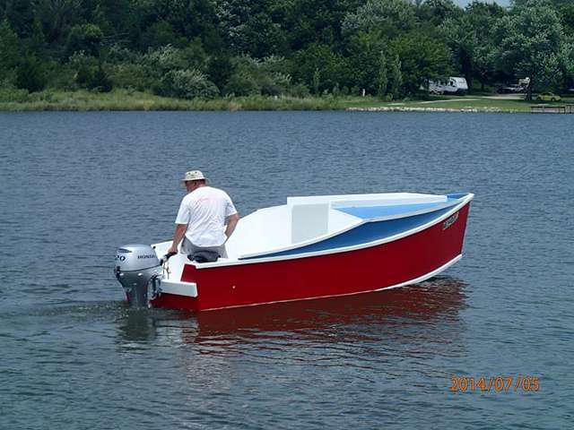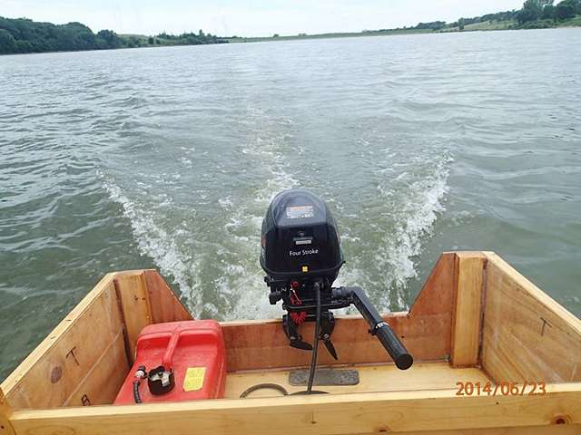 Puttin' along with minimal wake. I was disappointed with how the 10hp labored to get the boat on plane with nothing but me and 2 gallons of fuel aboard. I see a new 20hp in my very near future. |