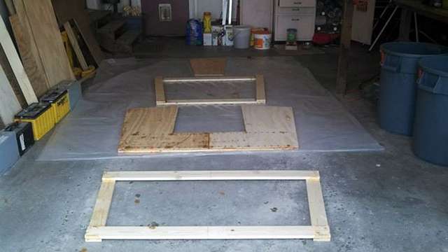 Four plywood sheets rough cut to shape of the bottom. I'll glue them together off the boat and then attach the assembled bottom to the hull. |
