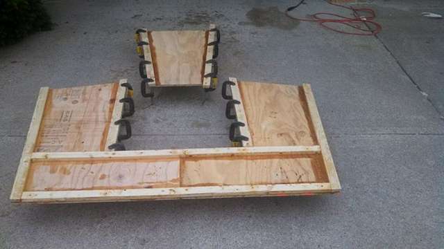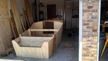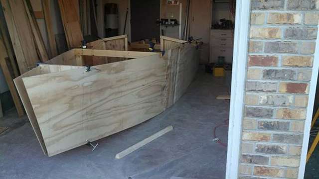Starting to look like boat. Frames and sides assembled with deck screws. Next step is to glue each bulkhead permanently. Will coat bulkheads with epoxy and 4oz fiberglass to prevent plywood checking. |