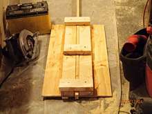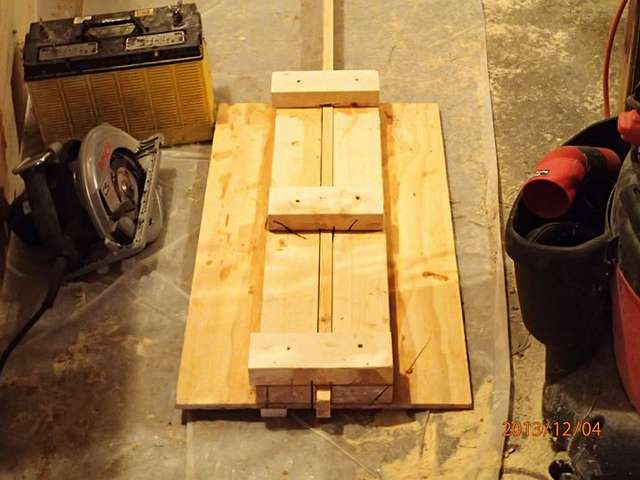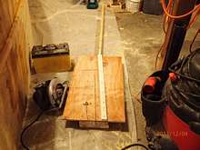 With this jig I can cut perfect 12:1 scarf joints with little effort and no finishing with a sander. I slide the stock into one end of the jig and make a cut with the circular saw. The fence forces the saw to cut a straight line at the correct angle. |
