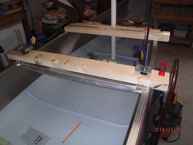 This is the leeboard thwart. I cut this from a spruce 2x6x8 from Lowes (it took some time to find a decent example). I ripped it down to fit the aluminum angle braces used for the leeboard support brackets. These brackets will be thru bolted. Notice the leeboard brackets are inverted to lower the weight and obtain maximum depth when lowered. Also note the home made clamps, these will be thru bolted with a fender and lock washer on top with the thumb screw knob underneath. This arrangement provides the best low profile for the leeboards. The factory thwart will be removed.