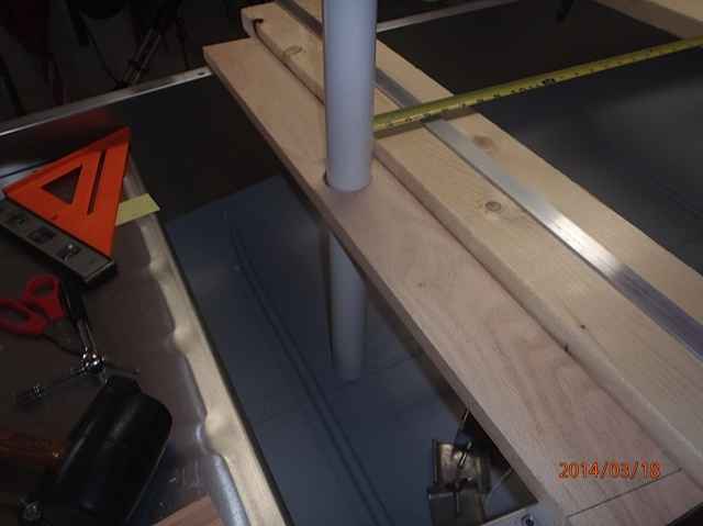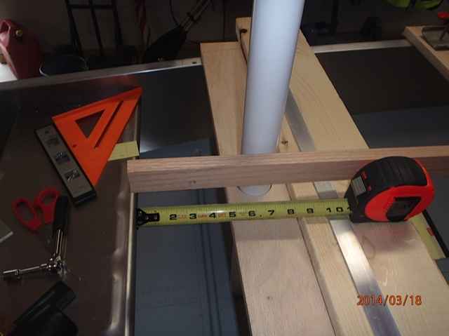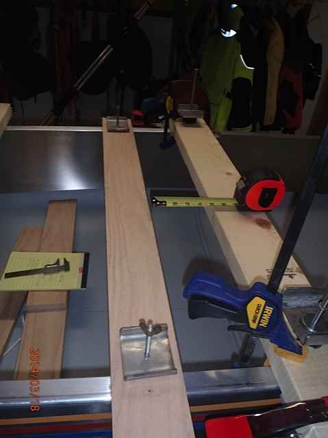 This is the oak 1x4 strut for attaching my two pontoons (I call them toons for short). I originally planned to use two struts, but the toons only weigh 11lbs each and a single strut should be strong enough. For good measure I will add a 1x2 screwed and epoxied strong back to this strut. The measurement of 5 inches is the distance forward of the leeboards this strut will be located (thru bolted to the railing). We need 5 inches clearance for the leeboards to rotate up and down.