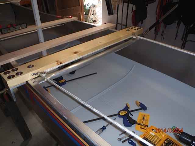 With the leeboards thwart in place I installed the blocks for the line steering. There are springs on the line and carribeaners to keep the line taught. I used 3/8 line for easy on the hands operation.