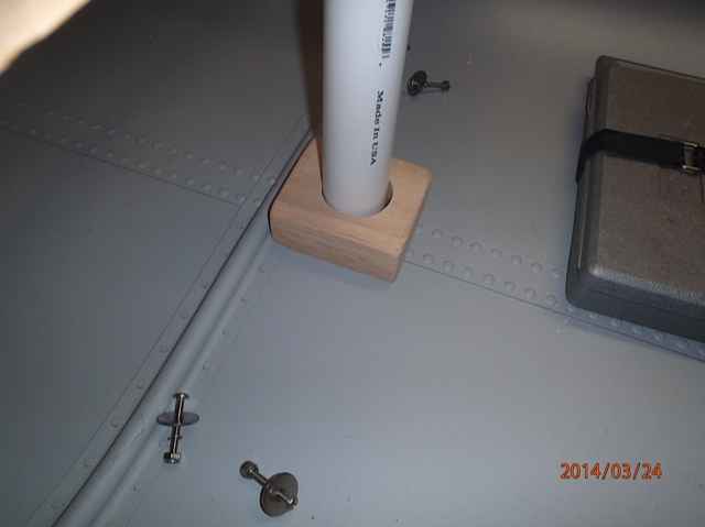 I have the oak thwart with the hole drilled for the mast. I used a 2" pvc pipe to measure and fit for plumb. Remember to level the canoe before you do this step. Since I'm using a balanced lug I want the mast straight up and down. Note the 2x6 just behind the oak 1x4 thwart. I may use it and drill the mast hole close to the forward part of the 2x6 thwart. The wider thwart would provide a location for installing rigging hardware and a place to set drinks/eats if we decide to have lunch aboard. The mast tab will be located flush with the edge of the rib and be about 3 1/2 inches long and 2 1/2 inches wide. Six rivets will be removed to install the tab, the actual tubular mast step will be thru bolted to this tab. The advantage of this arrangement is you can remove the mast step for using the canoe without the sailing rig. It's not necessary as you could leave the step in place, which I'll like do.