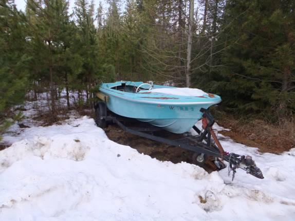 Poof! The second week of January, we had a thaw. Temps in the high forties. Rain, and then just clouds. The snow receded. SWMBO reminded me that, "that old blue boat" I had placed temporarily outside her sewing room window in September was no longer hidden under a snow drift. Further, it just didn't fit in with her idea of what should be parked in that particular patch of trees. As in, nothing-should.
