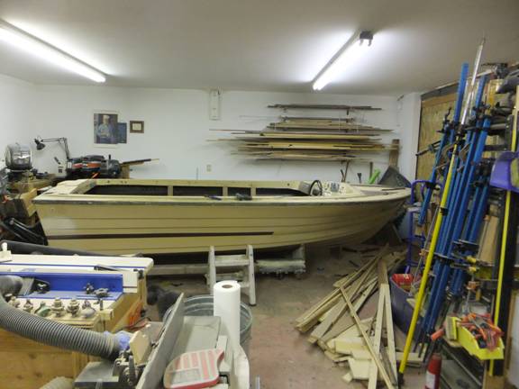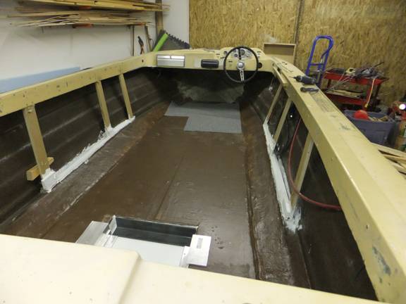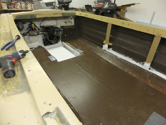 The floor is replaced, and the motor well-bilge pan is just about ready to receive that really-heavy Chevy Six. But, I’ll probably wait until all that climbing around during the building phase is done.