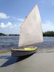 On our first sail, we zipped across the flats, the leeboard and rudder performing perfectly when we bumped the sandbars. With the downhaul mercilessly tensioned (per Michael Storer's lug sail advice), we pointed very high into the wind. We were surprised at the attention from other boaters as we scooted along. They acted like they'd never seen such an interesting craft.