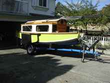 The brown arcs are exterior frames to help stiffen the roof. There are matching ribs on the interior of the hatches. Originally the roof/hatches were left clear epoxy over cedar. This resulted in a dark brown color and looked good in my opinion. But they were great heat sinks and cooked anybody inside thus the light coloured paint. Then the mast broke. It was a benign beautiful day at the Port Townsend Pocket Yachter's Pocket Palooza. On board were friends Scott and Christine, fellow students of the Small Craft Sailing Academy and all round competent people. They leapt into action and we soon had sail, spars and broken mast on board. My thanks to them both. Scott still thinks it was his fault the mast broke and I can probably milk this for a few beer. I think the failure was the result of a severe thrashing the boat received the previous October. There must have been concealed damage to the mast. I went home and built a new mast, similar the failed product. But the wheels were turning around the idea of a tabernacle. With the original slot top design the mast was raised from inside the cabin. Just fit the heel of the mast to the step and start walking it up until it arrived at the partner. Simple. With the new roof and hatches I had to start the process by removing them, step the mast and reinstall the roof. This was a pain in the anatomy. My intention was to have the tabernacle outside the cabin area ahead of the forward bulkhead. John Welsford (he was in Pt. Townsend at the time) suggested keeping it inside the cabin. I guess that he's not just another pretty face, there is a scheming brain working in there. I worked through the various issues that this created and went to a local welding shop where they made up a square section U which I bolted into the front bulkhead.