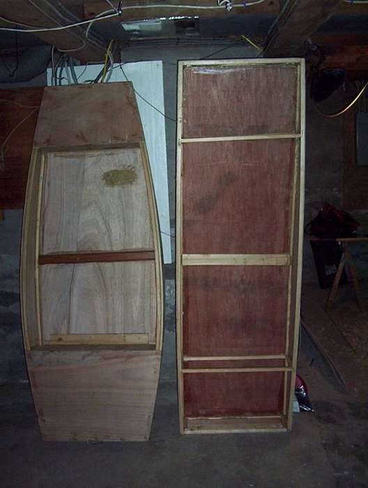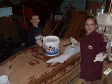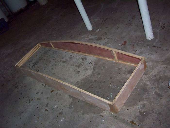 Now the frames and strips looked like a boat with invisible sides, so the next time the man came out to build, he glued panels on each side.