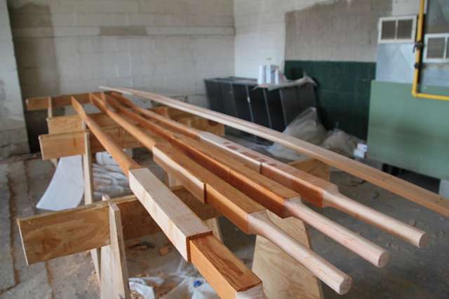 There is an ongoing debate among the clubs about length; we made ours 11' at the bow and stern and 11'10" at the middle two stations. The club rules specify no fancy metal oarlocks, and the plans show the Iron Age routh and kabe design, a pad with an upright block mortised into the rail. The oar has sacrificial wood boards (sclates) that bear on the pad and upright, and is held in place with a lanyard (humbliband in old dialect).