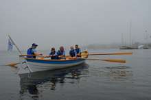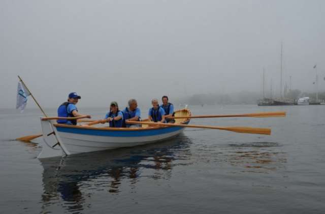 At the Woodenboat show in 2013 I was out rowing the whaleboat minding my own business when this apparition drifted out of the fog. It was sleek and beautiful and rowed by attractive smiling people. I was smitten. I had never seen a St Ayles Skiff before but went home determined to get one for my town.