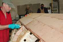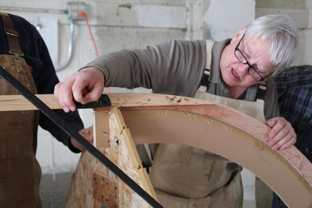 The planks are pre-spiled, but one still has to use arcane methods to fit the rolling bevels. Here we use a magic batten painted with flat black paint to determine the tricky bevel at the keelson/stem transition. The batten is rubbed along the lie of the plank and the black paint is planed off.