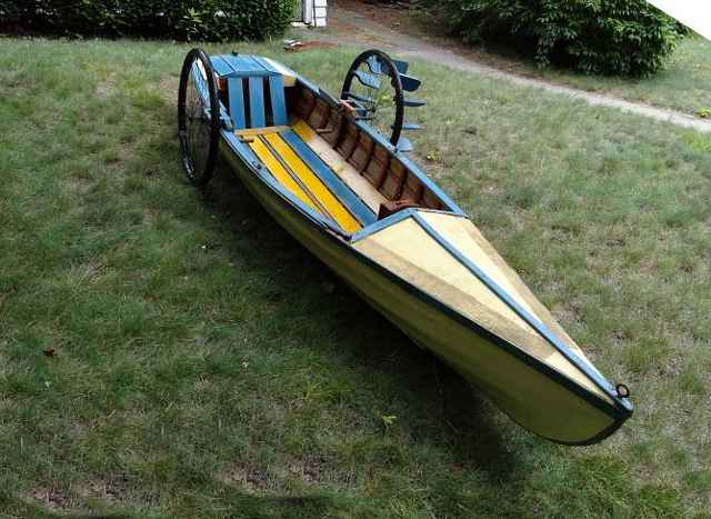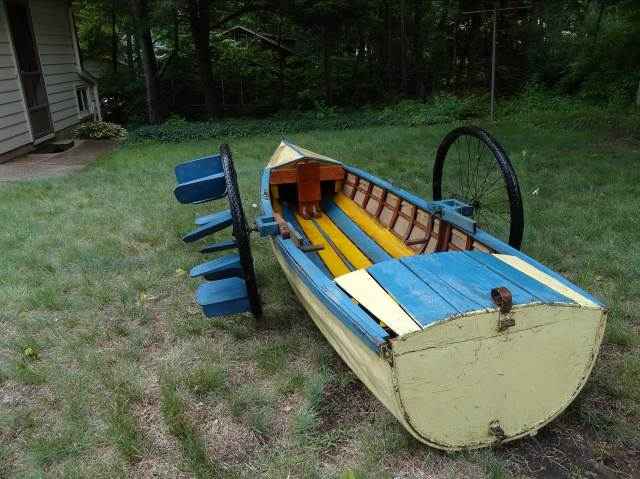 A boat like this is limited to only the calm, and therefore windless, days on Lake Michigan. Propelling the short boat with the paddle wheels was a slow process. Any attempt at a speed greater than hull speed brought copious amounts of water into the cockpit. Turns were slow. The round hull section made it rather tippy. But it provided a lot of entertainment for the family that summer.