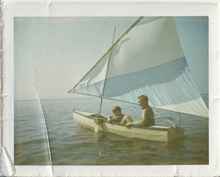 On Junk Day 1968 my father found a discarded aluminum golf cart on the curb. "Hey, with a little bit of plywood this would make a great rudder." Thus, the second chapter of the boat began. The flat aluminum piece that supported the bottom of the golf bag was easily bent up to keep the plywood in place and then glued in place with epoxy, pintles were secured with screws. (When I was growing up I thought that the handyman's secret weapons were baling wire and epoxy glue.)  A bonus to using the golf cart is that we could fold down the handle to make it easier to carry. In the picture below of me and my father out for a sail you can see the tiller is the handle of the golf cart.   Surprisingly, the golf cart rudder proved too Rube Goldberg-ish even for my father.  He eventually replaced it with a mahogany rudder.