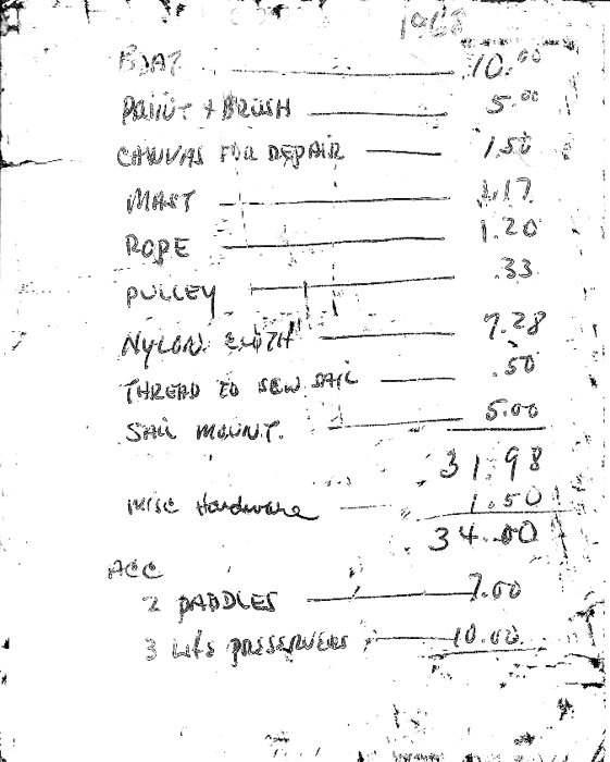 The next step was the sail. In those days, 12-foot long bamboo poles were used in the center of carpet rolls. A trip to the local carpet store was all it took to get free spars for the sail. Nylon fabric (Swedish blue and yellow, of course) and thread were obtained from the local fabric store. I know that my father sewed the sail himself. I am sure that my mother would have done it for him if he would have asked, but I think that he wanted to be self-sufficient when it came to the boat. The double dagger boards were made from 1x6 pine boards.  A functional sailboat for just $34!