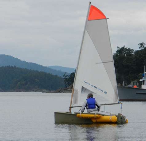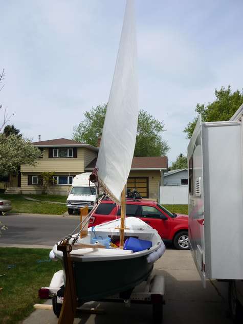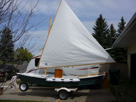 Your readers may be interested in my Bolger Windsprint. Having owned a Sunfish sailboat, I was impressed with the simplicity and performance on the lateen sail on the boat. So I modified the Windsprint to use a Pryde Sunfish sail. Other modifications are to the rudder, decks and flotation and a 1 3/4" full length keel. This makes the boat track like a train while rowing but slow in turns under sail, so I simply gybe. The boat sails amazingly well and is fast and stable. Great for a senior non-swimmer! I and any passengers ALWAYS wear life jackets. The boat is 12 years old now and still in great shape. It was built with a 3/8" bottom and 1/4" sides, all marine plywood with a fiberglassed bottom. The boat is painted with Behr Porch and Floor paint and has been a work in progress since her inception. The boat has become an exercise in simplicity.