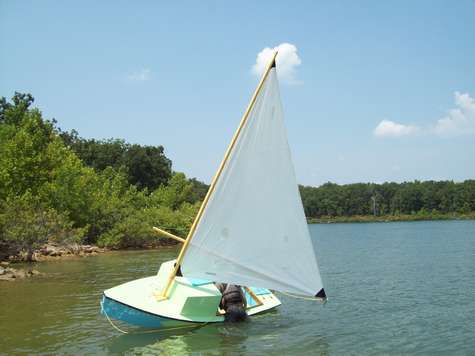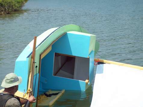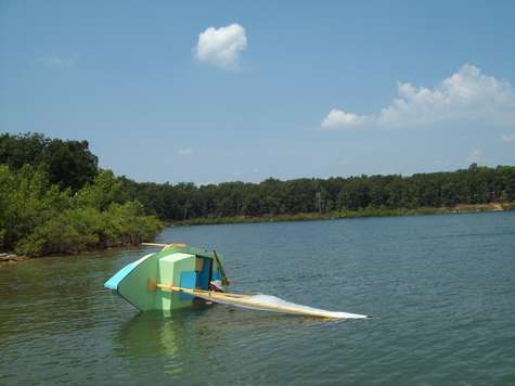 I finally got Fat Fly to the lake and capsized her. Boy is she hard to roll over, it was all I could do to dump her. She floats very high and not a drop got in the cabin. Winds were light so I didn't get to wring her out but it seems like she wants to sail very flat. Next big wind day I will knock off work in the boat shop and try her in some wind.