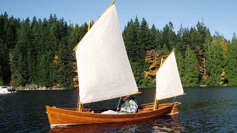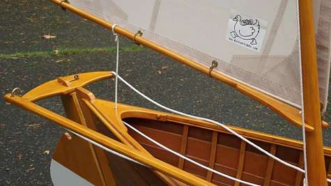 The idea was to draw a boat that could sail as well as be paddled with a double paddle. With three mast steps it can be configured as a standing lug ketch or sloop as conditions permit and we found in both ways it was well balanced. The steering for sailing consists of a yoke for the rudder and a push/pull tiller that took some getting used to. In paddling, the same yoke is rigged with lines that run up to foot pedals. This was last winter's project; challenging and tedious at times, built according to plan using red cedar for the planking and floor boards and Alaska cedar for everything else except white oak for frames. All the fasteners were stainless screws and copper clench nails for the planking. Everything is finished bright save the white paint on the bottom