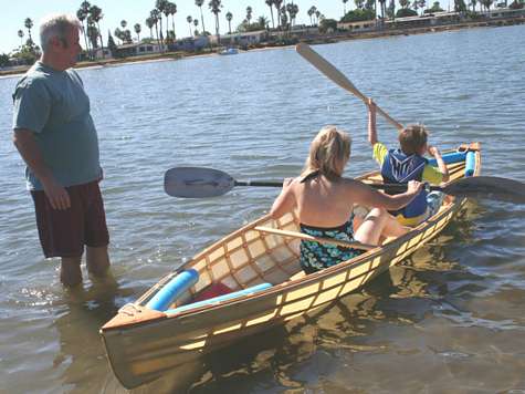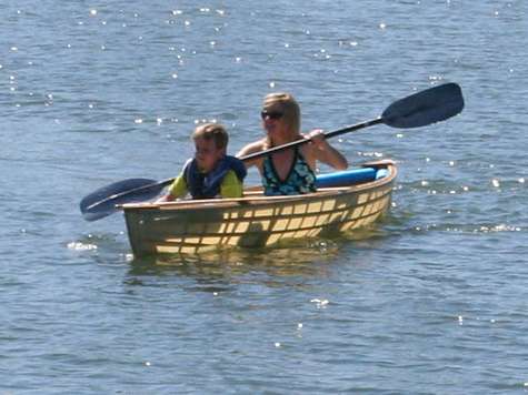 Although the wind was light, we found the it went along surprisingly easy and fast, the only sound was the delightful gurgling of water flowing under the laps. What was the best surprise was how it went upwind, much closer that I thought. Over all I can't say enough about how well things were worked out in the design. The only drawback is it is slow and hard to tack. This is expected given it's long keel with no centerboard. Also, it is a bit tippy too! But we can get used to that.