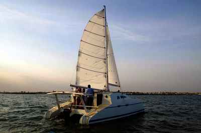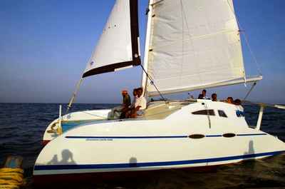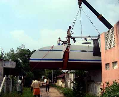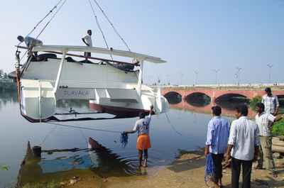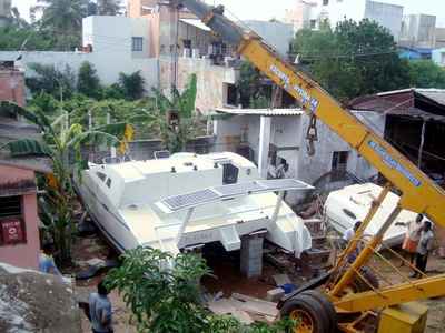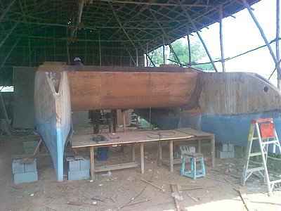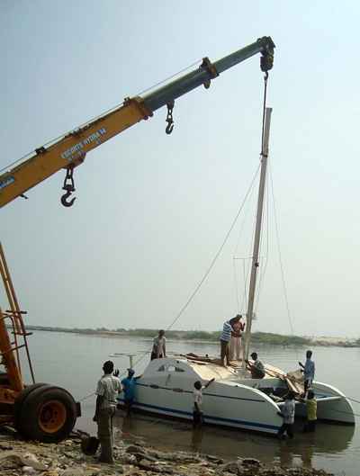 Here the next ECOnomy cruiser 7.5 which was built, this time, in India. Unfortunately, at the day of the "splash" there was almost no wind. But the people on the boat are happy and this is was counts. The area where the boat was built is a bit restricted so getting the boat out was not an easy task. Nevertheless, the boat workmanship looks great.