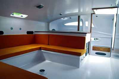 I finally settled on a name for my boat - Doodlebug. 10-1/2ft long and 56" wide inside the cabin. Rear seats are 30" long and angled for a better view under way. One adult or two kids per seat. I started with a simple idea two years ago - I wanted a small shanty type boat under 12ft long (lowest registration rate in Florida). I kept looking at the pictures of the Michalak Dockbox and figured out how to cut out a small corner section from a sheet of plywood 20" deep (and about 30" long) with an angle, that would become the cockpit by fiber glassing it to the other end.