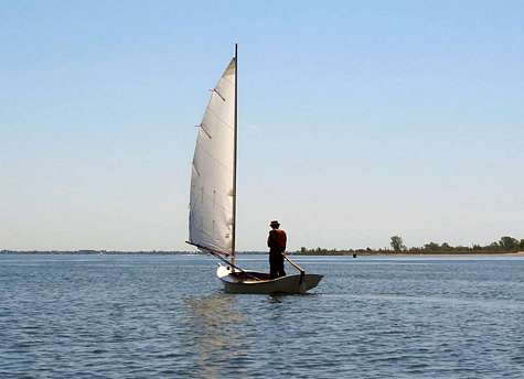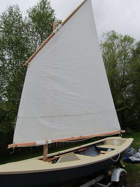 I followed his plans closely, including a hollow mast and yard. The sail is a balanced lug, from Sailrite. I built the outboard splash well, but the boat rows so nicely, the outboard stays at home.