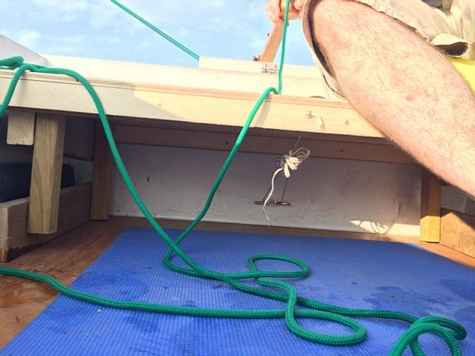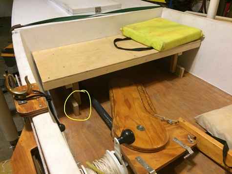 How does it lift out you ask? A small cleat center mounted low on the aft cockpit wall provides an anchor point for a line running up to the forward cross stiffener. Did you get that? Think "draw the bench aft and down" and you get the idea. The cleat arrangement allows easy removal.