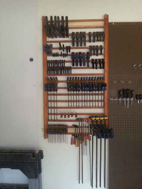 This doesn't happen often. Clamps organized and out of the way. The rack used to be the front of an old crib that went out of service years ago. Attached to the wall with cleats so there is a little space behind each rail.