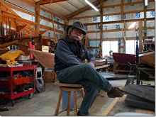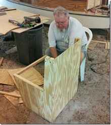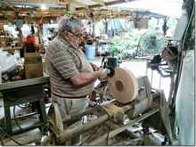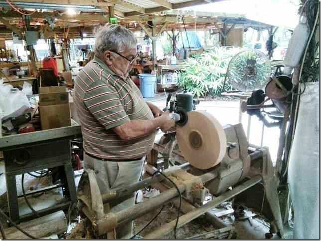 I want a custom steering wheel for my new boat so Howard is making me one from a big block of cherry that Steve had. He's finding this stuff really hard to work on the lathe. Here he's using a grinder to get the high spots off and smooth it out. They say that cherry is easy to work but he's not finding that to be the case. This block is really hard and tight grained. Maybe because it's so big and old. Wally's making seats for his river cruiser, I keep breaking the one rule about not helping by telling him to make them bigger.