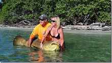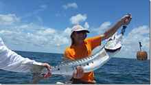Here's Kathy with a tarpon on or as they're known here, shark bait. It's almost impossible to land a tarpon without a big shark getting it. Lance got this big 'cuda when they went a little farther offshore.
