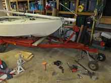 The trailer, here, is tiled up at about 15 degrees, and I could roll the boat off onto the garage floor with the bow line released. Just a few quarter-rotations with a wrench! There's more. But, you've probably seen all the Too Cool Fer School stuff you care to, for today.