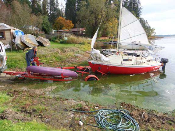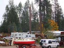 What had been one of those delightful moments we sailors search for, and cherish when we find, had been shattered just like the thousands of old growth pine trees no longer standing in the surrounding hills. Time to hyakko for the trailer! At least the motor had been tilted up when I did all that banging and crashing with the rudder.