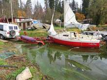 Let's see. Current total. Busted rudder. Probably major damage to the keel. Busted ¼" steel plate that holds a significant part of the trailer assembly. Major strain to the bow eye, as the boat was dragged bodily over a mud bank. And, we're still not on the trailer.